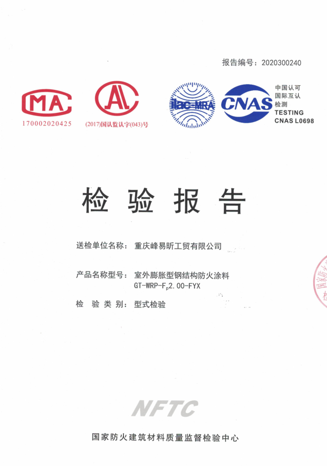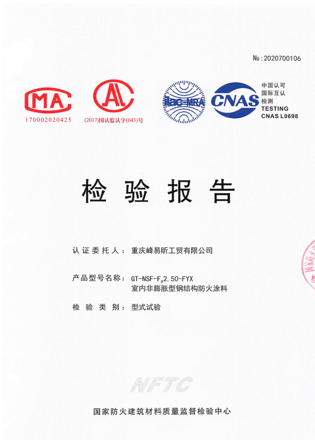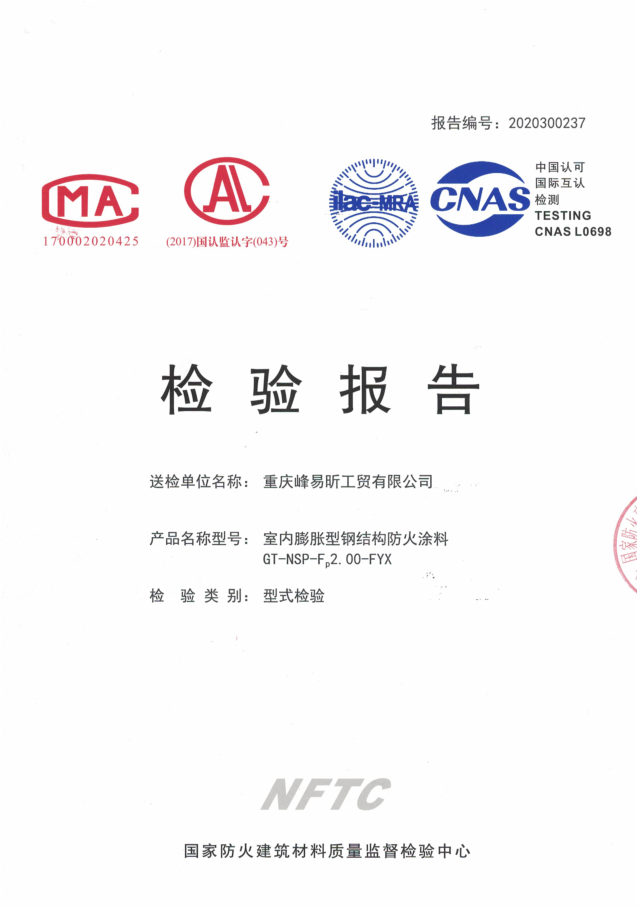 防火涂料產(chǎn)品全部通過(guò)國(guó)家建筑防火材料監(jiān)督檢驗(yàn)中心型式檢驗(yàn)合格和應(yīng)急管理部消防產(chǎn)品合格評(píng)定中心認(rèn)證。